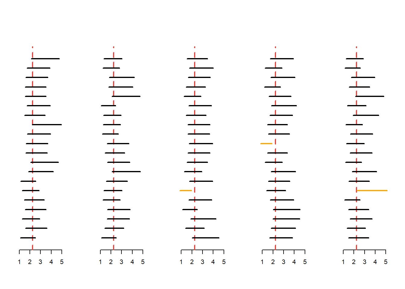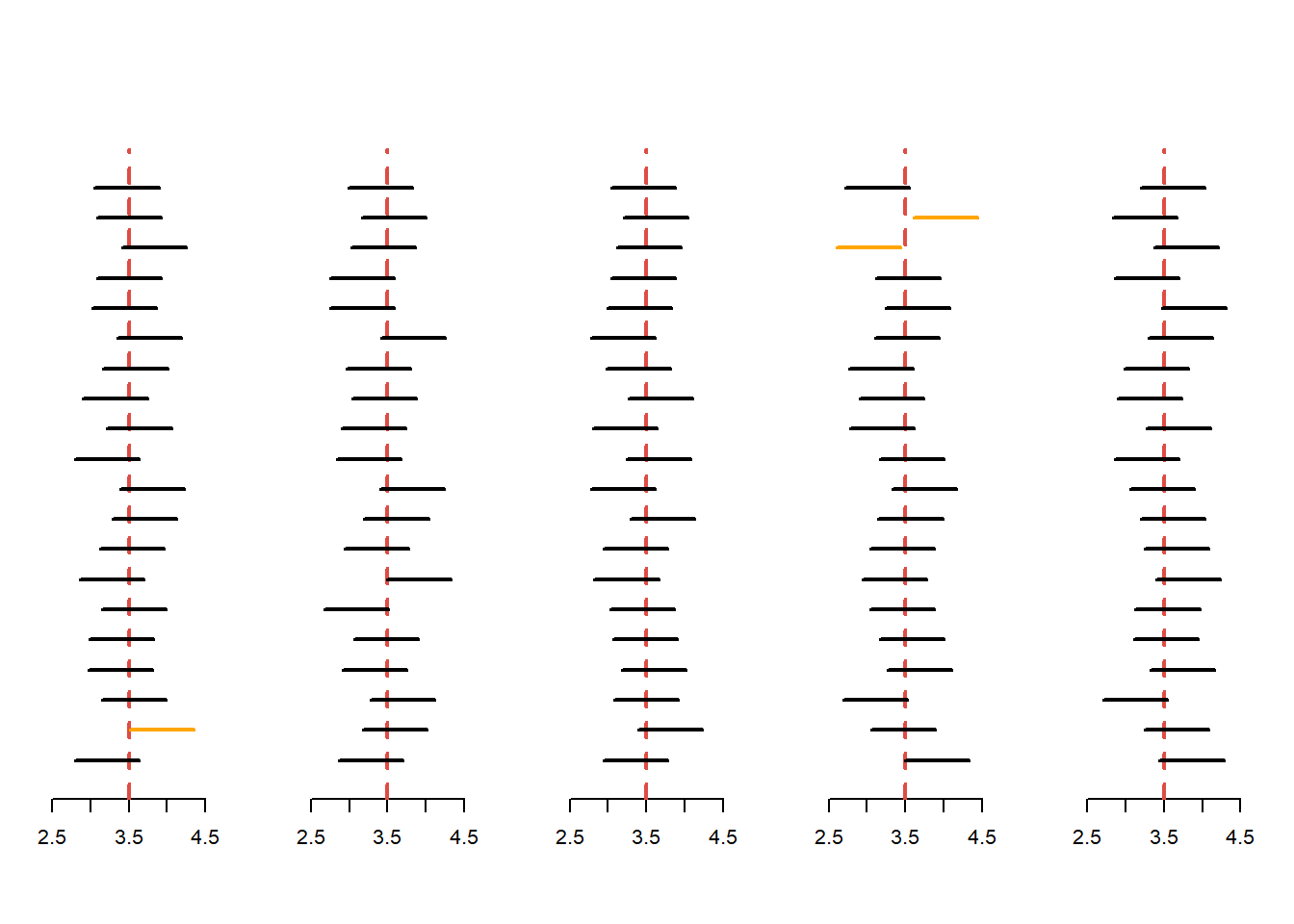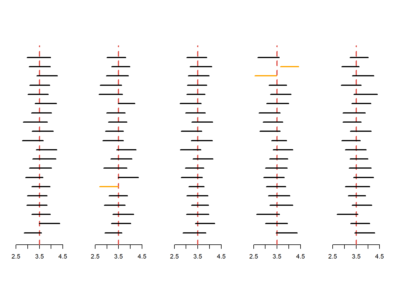 O ilustrare a \(100\) de intervalele de încredere de nivel de încredere \(1-\alpha = 0.95\) pentru media unei populații normale \(\mathcal{N}(3.5, 1.5^2)\) atunci când \(\sigma = 1.5\) este cunoscut este afișată mai jos: