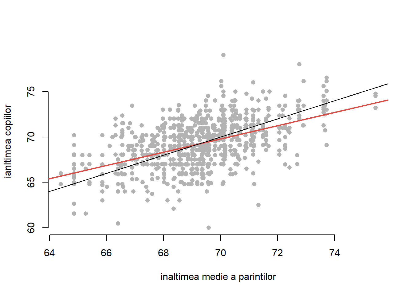 data_Galton <-read.table("dataIn/galton-stata11.tab", header =TRUE)data_Galton <- data_Galton %>%mutate(mother_c =1.08* mother,avg_parents = (father + mother_c)/2,height_c =ifelse(gender =="F", 1.08*height, height))plot(data_Galton$avg_parents, data_Galton$height_c,bty ="n",xlab ="inaltimea medie a parintilor",ylab ="ianltimea copiilor", pch =16,col ="grey70")galton_model <-lm(height_c ~ avg_parents, data = data_Galton)abline(galton_model$coefficients, col = myred,lwd =2, lty =1)abline(a =0, b =1)