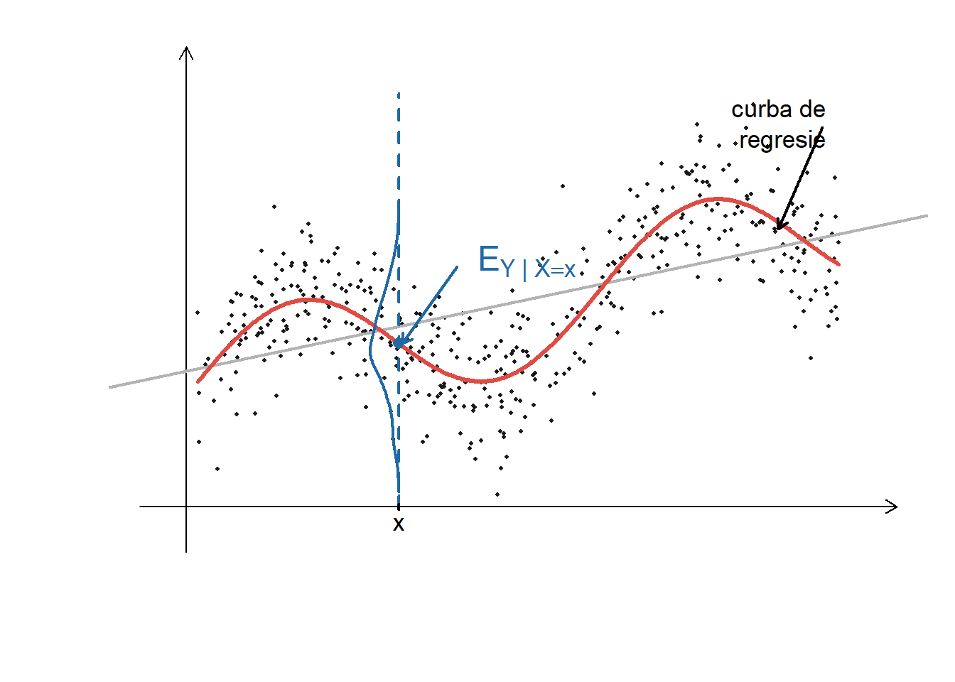 set.seed(1)## Exemplu de date n <-450x <-sort(runif(n, 0, 10))f <-function(x) 0.25*x +sin(x)# curba "adevărată"y <-f(x) +rnorm(n, sd =0.6)x0 <-3.2# poziția (x din desen)h <-0.5# jumătate din fereastra |x-x0|<=h folosită pt densitate## Fit-uri pentru curbefit_loess <-loess(y ~ x, span =0.25)fit_lm <-lm(y ~ x)# yhat0 <- predict(fit_loess, newdata = data.frame(x = x0))yhat0 <-f(x0)## Setări plotxr <-range(x); yr <-range(y)padx <-0.9; pady <-0.9par(mar =c(4,4,1,1))plot(x, y, pch =16, cex =0.45, col ="grey10",axes =FALSE, xlab ="", ylab ="",xlim =c(xr[1]-padx, xr[2]+padx),ylim =c(yr[1]-pady, yr[2]+pady))## Axe cu săgețiarrows(xr[1]-padx, yr[1]-0.2*pady, xr[2]+padx, yr[1]-0.2*pady,length =0.10, lwd =1)arrows(xr[1]-0.2*padx, yr[1]-pady, xr[1]-0.2*padx, yr[2]+pady,length =0.10, lwd =1)## Linia gri (regresie liniară) + curba roșie (regresie neliniară)abline(fit_lm, col ="grey70", lwd =2)xx <-seq(xr[1], xr[2], length.out =400)lines(xx, f(xx),col = myred, lwd =3)## Linia verticală punctată la x0segments(x0, yr[1]-0.2*pady, x0, yr[2]+0.2*pady,col = myblue, lty =2, lwd =2)## densitatea lui Y pentru X aproape de x0idx <-abs(x - x0) <= hd <-density(y[idx], n =200)scale <-0.75# lățimea violinului (în unități de x)x_left <- x0 - d$y*scalelines(x_left, d$x, col = myblue, lwd =2)## Punctul E[Y|X=x0] pe curba roșie + săgeată + etichetăpoints(x0, yhat0, pch =16, col = myblue, cex =1.1)arrows(x0 +0.9, yhat0 +1.2, x0 +0.05, yhat0,col = myblue, lwd =2, length =0.08)text(x0 +1.0, yhat0 +1.2,bquote(E[Y~"|"~X==x]),col = myblue, pos =4, cex =1.5)## Marcaj “x” pe axa Oxsegments(x0, yr[1]-0.25*pady, x0, yr[1]-0.15*pady, lwd =2)text(x0, yr[1]-0.5*pady, "x", cex =1.1)## Etichetă “curba de regresie” cu săgeată spre curba roșiex_lab <-as.numeric(quantile(x, 0.9))y_lab <-predict(fit_loess, newdata =data.frame(x = x_lab))text(xr[2]-0.2, yr[2]+0.1, "curba de\nregresie", adj =c(1,1), cex =1.1)arrows(xr[2]-0.25, yr[2]-0.35, x_lab, y_lab, length =0.08, lwd =2)