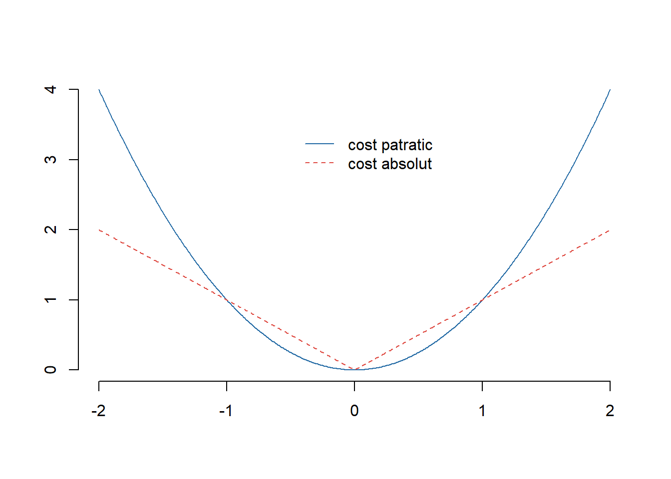 t <-seq(-2, 2, by =0.01)c_q <- t^2c_a <-abs(t)plot(t, c_q, type ="l", bty ="n", col = myblue, xlab ="", ylab ="")lines(t, c_a, lty =2, col = myred)legend(x =-0.5, y =3.5, legend =c("cost patratic", "cost absolut"), lty =c(1, 2), col =c(myblue, myred), bty ="n")
