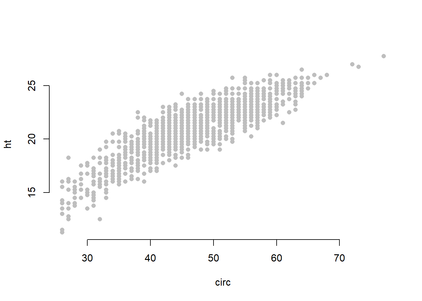 # incarcati setul de date din locatia corespunzatoareeucalypt <-read.table("dataIn/eucalyptus.txt", header=T,sep=";")plot(ht~circ,data=eucalypt,pch =16,col ="grey",xlab="circ",ylab="ht", bty ="n")
