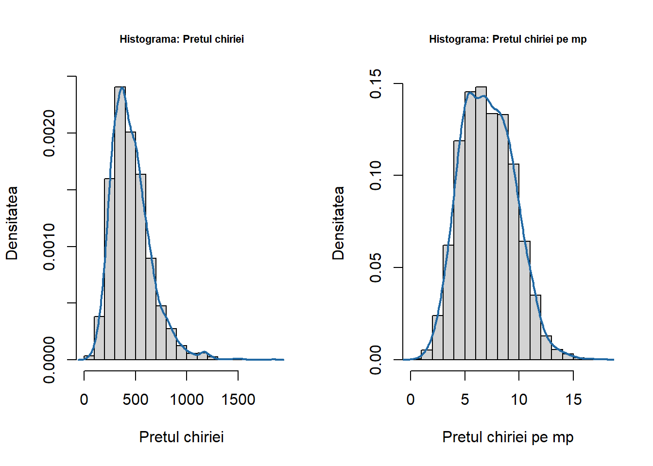 munich <-read.table("dataIn/rent99.raw", header =TRUE)par(mfrow =c(1,2))hist(munich$rent, probability =TRUE, main ="Histograma: Pretul chiriei",cex.main =0.7,xlab ="Pretul chiriei",ylab ="Densitatea")lines(density(munich$rent))hist(munich$rentsqm, probability =TRUE, main ="Histograma: Pretul chiriei pe mp", cex.main =0.7,xlab ="Pretul chiriei pe mp",ylab ="Densitatea")lines(density(munich$rentsqm))