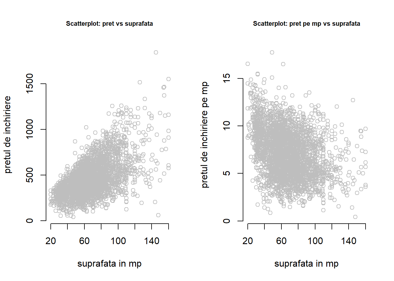 par(mfrow =c(1,2))plot(rent~area,data = munich,main ="Scatterplot: pret vs suprafata",cex.main =0.7,col ="grey",xlab ="suprafata in mp",ylab ="pretul de inchiriere", bty ="n")plot(rentsqm~area,data = munich,main ="Scatterplot: pret pe mp vs suprafata",cex.main =0.7,col ="grey",xlab ="suprafata in mp",ylab ="pretul de inchiriere pe mp", bty ="n")