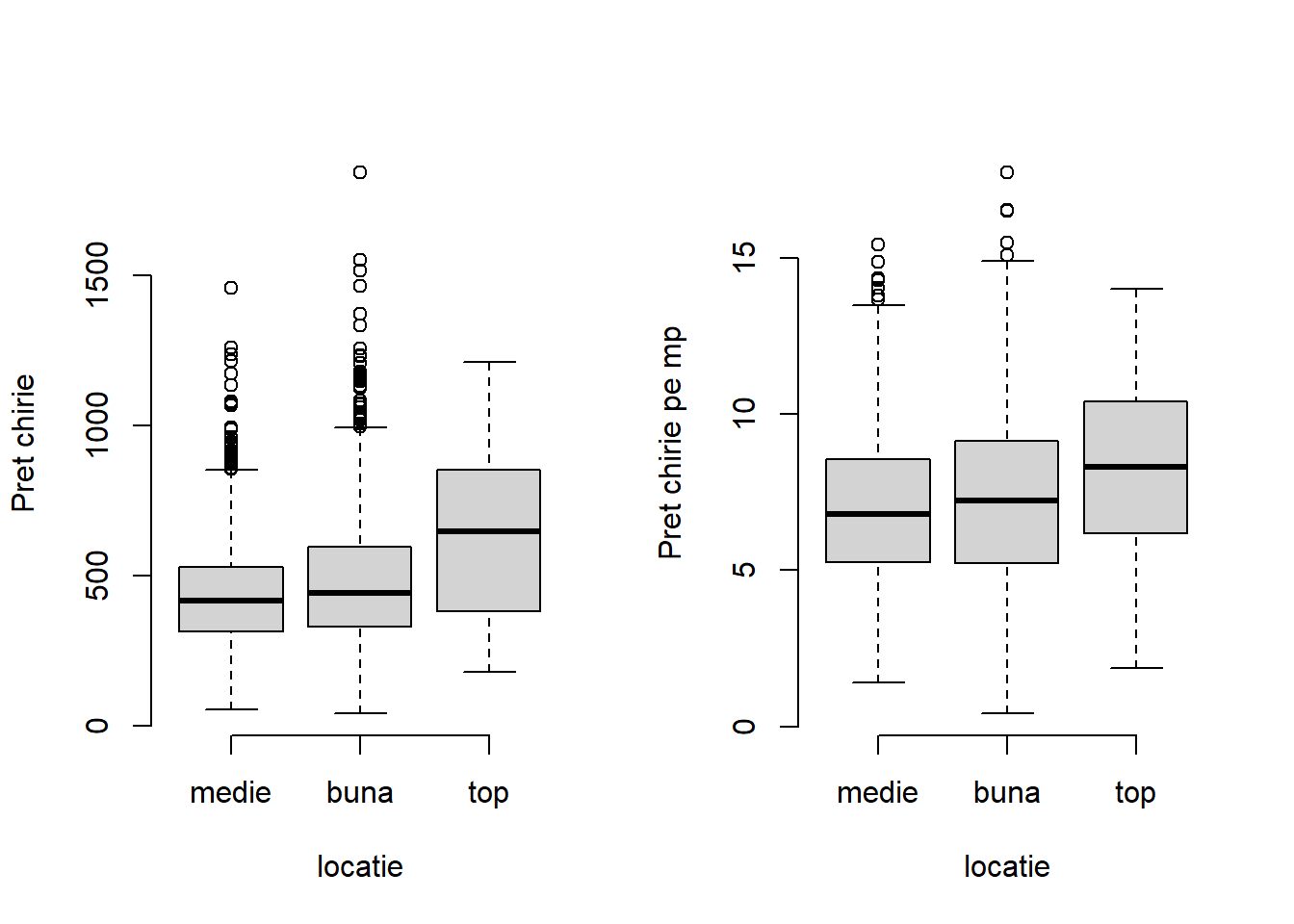Atunci când variabila explicativă este categorială este de preferat utilizarea boxplot-ului (diagramei cu mustăți). Astfel, în figura următoare se poate observa că valoarea mediană a prețului lunar net al chiriei crește odată cu calitatea locației apartamentului.