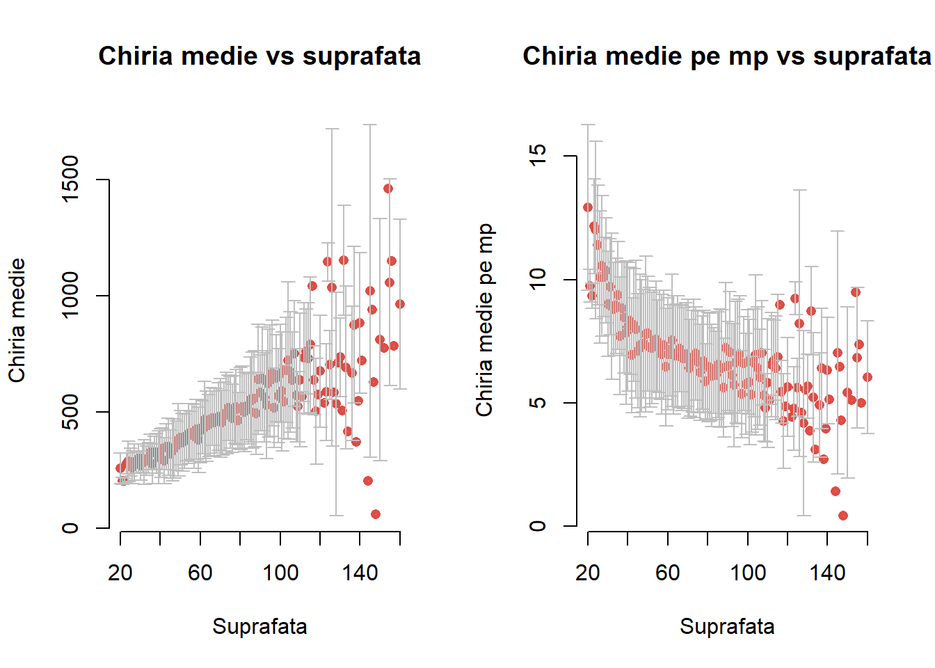 munich_rent_area <- munich %>%group_by(area) %>%summarise(mean_rent =mean(rent, na.rm =TRUE), median_rent =median(rent, na.rm =TRUE), n =n(),sd_rent =ifelse(n>1, sd(rent, na.rm =TRUE), mean_rent), low_rent =ifelse(n>1, mean_rent - sd_rent, mean_rent),up_rent =ifelse(n>1, mean_rent + sd_rent, mean_rent))munich_rentsqm_area <- munich %>%group_by(area) %>%summarise(mean_rent =mean(rentsqm, na.rm =TRUE), median_rent =median(rentsqm, na.rm =TRUE), n =n(),sd_rent =ifelse(n>1, sd(rentsqm, na.rm =TRUE), mean_rent), low_rent =ifelse(n>1, mean_rent - sd_rent, mean_rent),up_rent =ifelse(n>1, mean_rent + sd_rent, mean_rent))# plotpar(mfrow =c(1,2))plot.with.errorbars(munich_rent_area$area, munich_rent_area$mean_rent, munich_rent_area$low_rent, munich_rent_area$up_rent, main ="Chiria medie vs suprafata", xlab ="Suprafata",ylab ="Chiria medie")plot.with.errorbars(munich_rentsqm_area$area, munich_rentsqm_area$mean_rent, munich_rentsqm_area$low_rent, munich_rentsqm_area$up_rent, main ="Chiria medie pe mp vs suprafata", xlab ="Suprafata",ylab ="Chiria medie pe mp")
