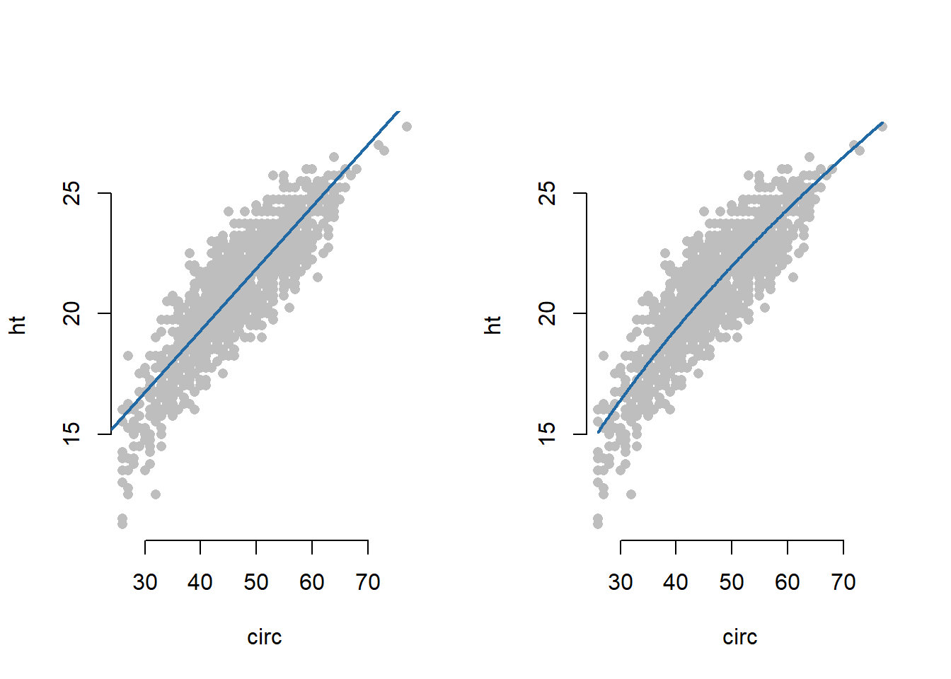 Observăm că pentru o creștere în circumferință de un \(1\) cm avem o creștere medie în înălțime de 25.7 cm. De asemenea putem remarca din figura de mai jos imaginea din stânga, că pentru valori mici ale circumferinței arborilor acestea se regăsesc sub dreapta de regresie ceea ce sugerează o relație neliniară între înălțime și circumferință. Astfel, putem considera un model simplu de tipul