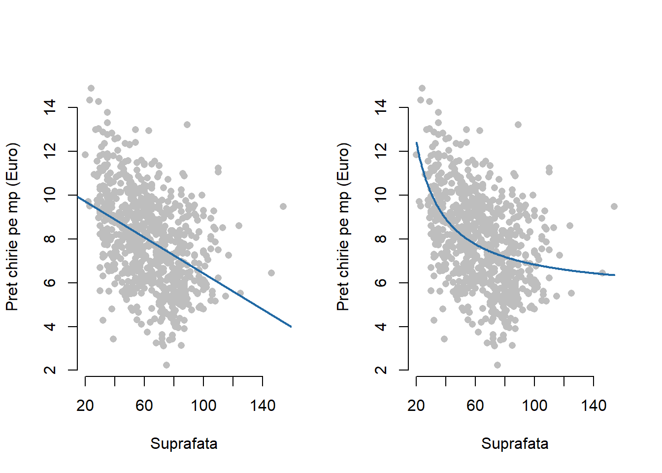ceea ce arată că prețul mediu pe \(m^2\) scade neliniar odată cu creșterea suprafeței apartamentului (a se vedea imaginea din dreapta din figura de mai jos în care putem constata o mai bună ajustare a modelului pe date). De exemplu, diferența în medie dintre prețul pe \(m^2\) al unui apartament de \(35\,m^2\) față de unul de \(36\,m^2\) este