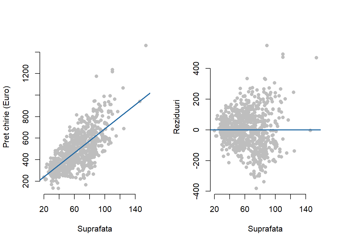 ceea ce ar sugera că o relație neliniară între variabila răspuns și variabila explicativă ar fi mai potrivită (același lucru se observă și din imaginea din stânga a figurii de mai jos). O mai bună ajustare pe date se poate obține definind variabila explicativă \(x = \frac{1}{suprafata}\) care ar conduce la modelul de regresie