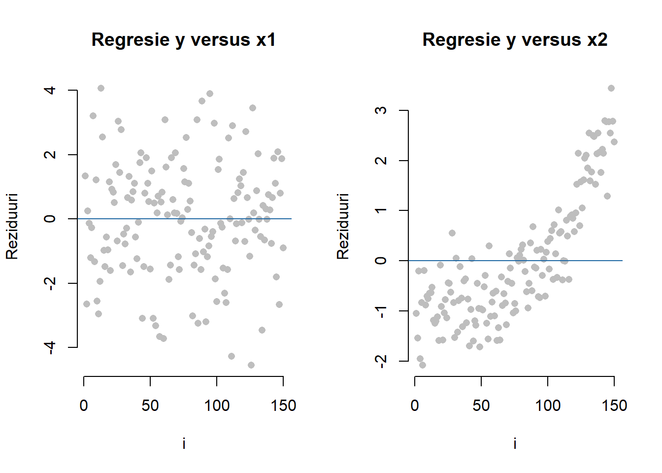 În cazul în care variabila predictor \(x_1\) nu a fost observată atunci modelul ajutat devine \(\hat y_i = 0.179 -0.646 x_1\) dar în acest caz graficul reziduurilor prezintă o autocorelare a erorilor (figura din dreapta). Motivul pentru care apare acest fenomen este că variabila explicativă \(x_1\) prezenta un caracter temporal pe când covariabila \(x_2\) nu iar efectele acestora, \(\beta_1 x_1\) respectiv \(\beta_2 x_2\), au fost absorbite în termenul eroare. Mai exact, dacă variabila explicativă \(x_1\) (respectiv \(x_2\)) este omisă din model atunci termenul eroare devine \(\tilde\varepsilon = \beta_1 x_1 + \varepsilon\) (respectiv \(\tilde\varepsilon = \beta_2 x_2 + \varepsilon\)). Cum covariabila \(x_2\) nu prezintă un trend temporal, efectul ei păstrează necorelarea termenului eroare. Pe de altă parte, atunci când efectul covariabilei \(x_1\), care prezintă un trend temporal, este absorbit în termenul eroare acest fapt este reflectat în autocorelarea valorilor reziduale.