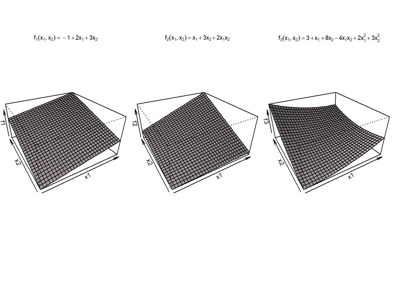 De asemenea, \(f_1(x_1,x_2) = \beta_0 + \beta_1 x_1 + \beta_2 x_2\), \(f_2(x_1, x_2) = \beta_0 + \beta_1 x_1 + \beta_2 x_2 + \beta_3 \underbrace{x_1 x_2}_{x_3}\) sau \(f_3(x_1, x_2) = \beta_0 + \beta_1 x_1 + \beta_2 x_2 + \beta_3 \underbrace{x_1 x_2}_{x_3}+ \beta_4 \underbrace{x_1^2}_{x_4}+ \beta_5 \underbrace{x_2^3}_{x_5}\) sunt toate funcții liniare în \(\symbf\beta\).