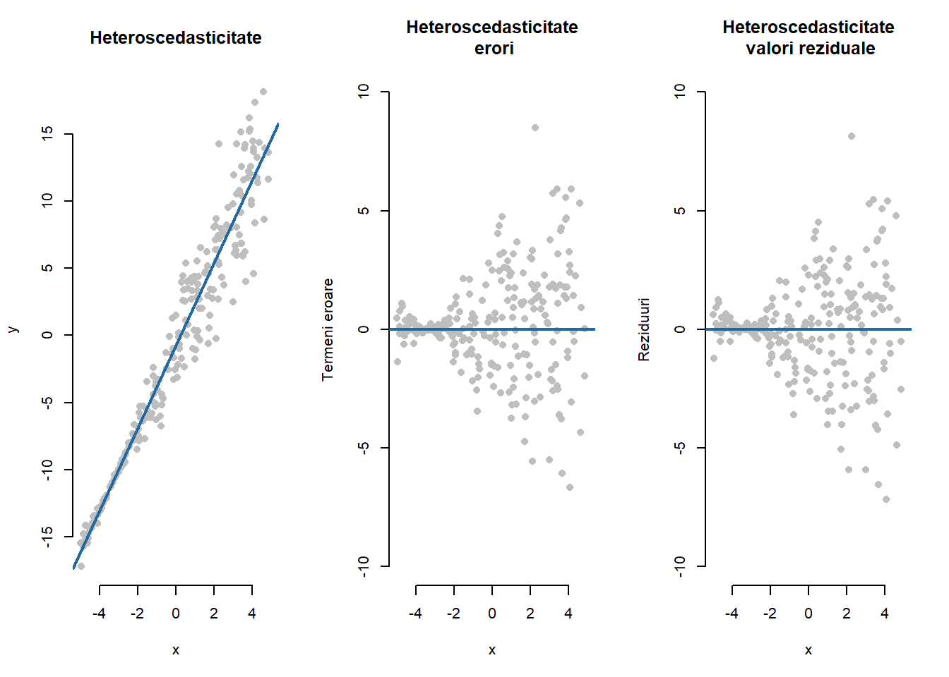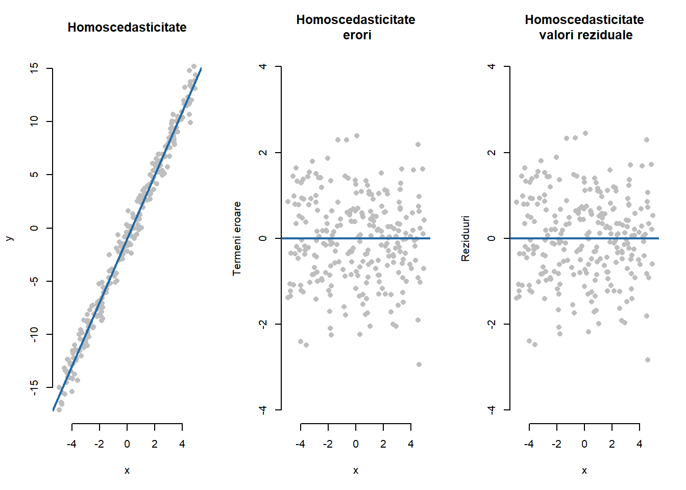 În al doilea rând, dacă facem referire la termenii eroare \(\varepsilon_i\) (cei care descriu incertitudinea modelului) aceștia trebuie să fie de medie \(0\), \(\mathbb{E}[\varepsilon_i] = 0\) sau sub formă matriceală \(\mathbb{E}[\symbf \varepsilon] = 0\), să aibă varianță constantă (homoscedasticitate) \(Var(\varepsilon_i) = \sigma^2\) și să fie necorelate \(Cov(\varepsilon_i, \varepsilon_j) = 0\) pentru \(i\neq j\). Ipoteza de homoscedasticitate și necorelare poate fi scrisă sub forma matriceală \(Cov(\symbf\varepsilon) = Var(\symbf\varepsilon) = \mathbb{E}[\symbf\varepsilon\symbf\varepsilon^\intercal] = \sigma^2 I_n\). Să remarcăm că în contextul modelului condiționat aceste ipoteze se scriu sub forma \(\mathbb{E}[\symbf\varepsilon|\symbf X] = 0\) și respectiv \(Cov(\symbf\varepsilon|\symbf X) = \sigma^2 I_n\) dar pentru ușurință vom elimina condiționarea din notație aceasta fiind subînțeleasă din context.
