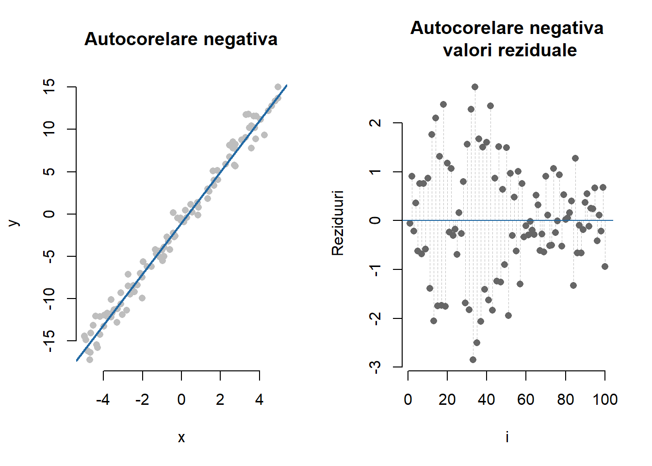 lwd = 1, lty = 1)Următoarea figură ilustrează un exemplu clasic de autocorelare negativă a termenilor eroare. În această situație, termenii eroare pozitivi (negativi) sunt urmați cu precădere de termeni eroare negativi (pozitivi), prin urmare observăm frecvent o alternare a semnelor termenilor eroare. Modelul din figură este generat după relația \(y_i = -1 + 3x_i + \varepsilon_i\) unde \(x_i\sim\mathcal{U}[-5,5]\) iar \(\varepsilon_i = -0.9\varepsilon_{i-1} + u_i\) cu \(u_i\sim\mathcal{N}(0, 0.5^2)\).