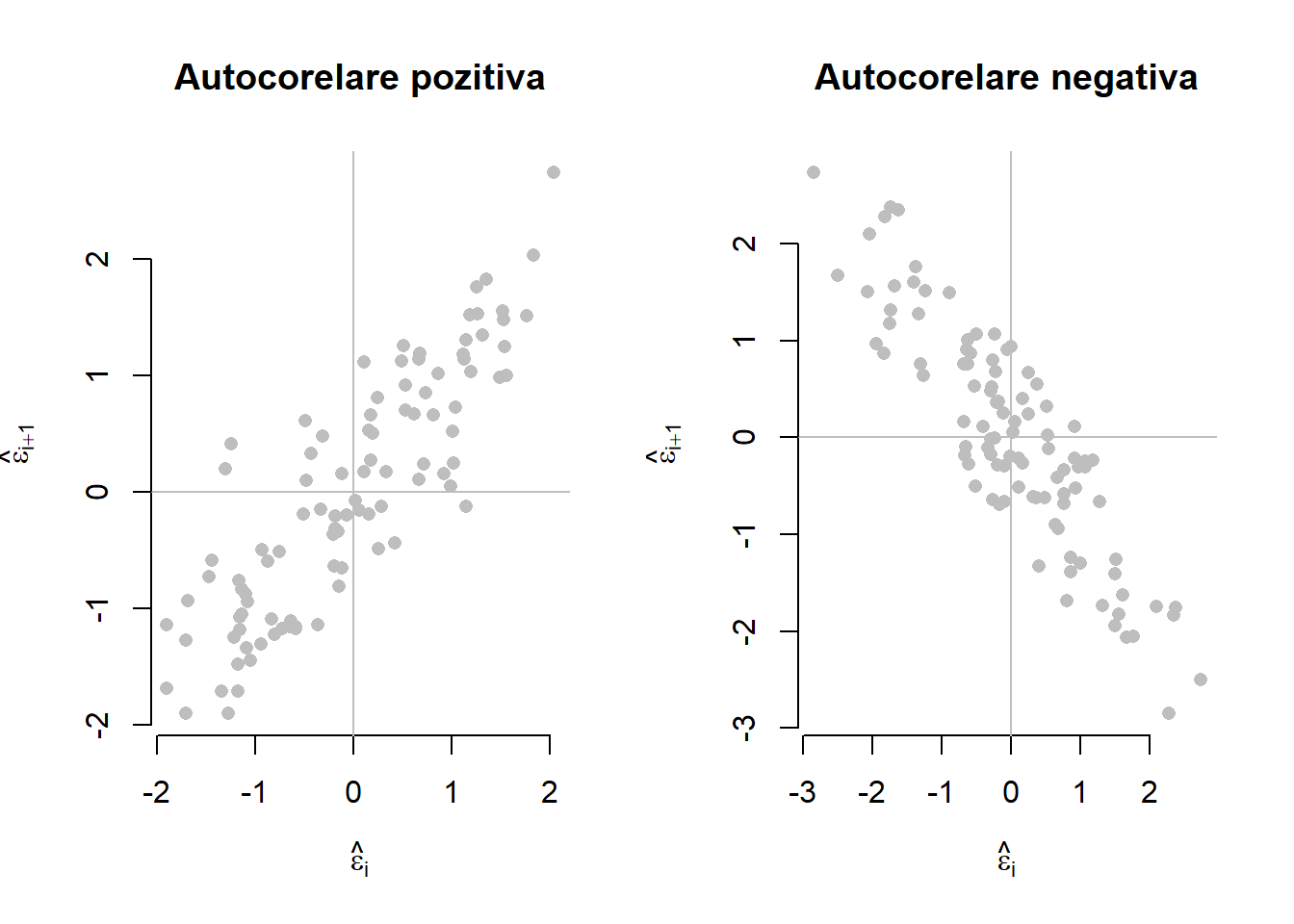Ipoteza \(\mathcal{H}_2\) presupune pe lângă homoscedasticitatea termenilor eroare și că aceștia sunt necorelați, i.e. \(Cov(\varepsilon_i, \varepsilon_j)=0\) pentru \(i\neq j\). Această ipoteză poate să nu fie conformă cu realitatea în special atunci când avem de-a face cu serii de timp sau date longitudinale (date care presupun eșantionarea acelorași unități de eșantionare la momente diferite de timp, e.g urmărirea și eșantionarea lunară a unor caracteristici de interes - viremia - pentru o serie de pacienți cu o boală gravă în vederea caracterizării stării imunității acestora). În aceste situații se observă o autocorelare a termenilor eroare. De exemplu, o autocorelare de ordin unu a termenilor eroare implică o relație liniară între eroarea la momentul \(i\) și eroarea la momentul \(i-1\), e.g. \(\varepsilon_i = \rho \varepsilon_{i-1} + u_i\) unde \(u_i\) sunt variabile aleatoare independente și indentic repartizate iar o autocorelare de ordin \(k\) se scrie sub forma \(\varepsilon_i = \sum_{t = 1}^{k}\rho_t\varepsilon_{i-t} + u_i\).