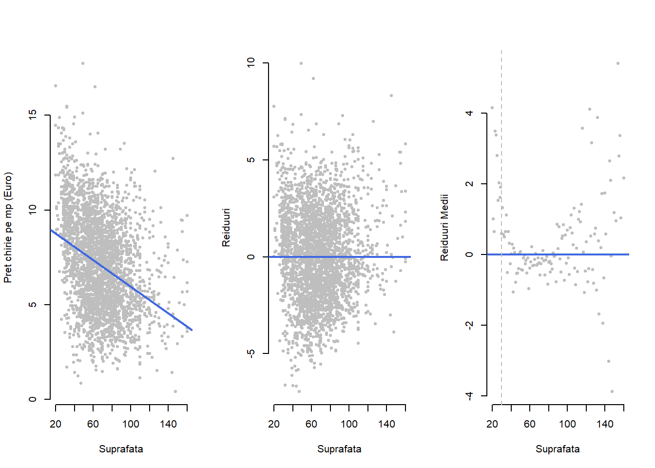 În Figura 1.1 de mai jos avem ilustrat grafic modelul de regresie astfel: în subfigura din stânga avem diagrama de împrăștiere cu dreapta de regresie, în subfigura din mijloc avem graficul valorilor reziduale iar în subfigura din dreapta avem valorile reziduale medii calculate pentru fiecare valoare a suprafeței de locuit. Observăm că pentru apartamentele cu suprafața mică (suprafața mai mică de 30 metrii pătrați) valorile reziduale sunt predominant pozitive (mai exact peste \(88\%\) dintre acestea au reziduuri pozitive) ceea ce sugerează existența unei relații neliniare între preț pe metru pătrat și suprafață.