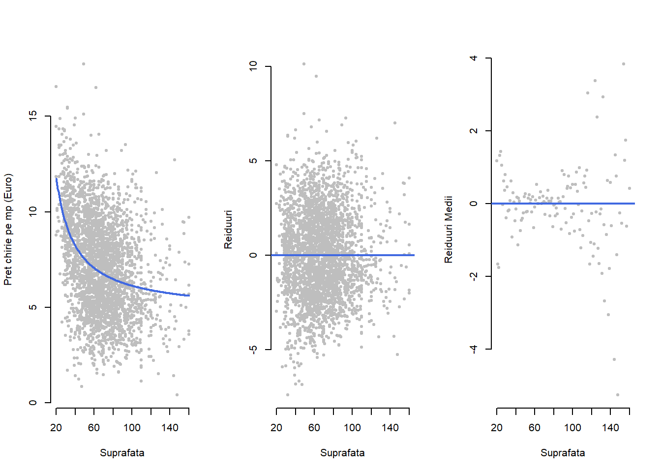 Relația neliniară dintre răspunsul mediu și covariabila suprafața locuinței este ilustrată în Figura 1.2 de mai jos. Se constată că, per total, prețul mediu net al chiriei pe metrul pătrat descrește odată cu creșterea suprafeței de locuit dar această descreștere este mai abruptă pentru apartamentele cu suprafață mică (până în jurul valorii de 40 de \(m^2\)) după care aceasta devine aproape liniară cu o tendință de nivelare în jurul valorii de 100 de \(m^2\). Graficele valorilor reziduale (sau reziduale medii) sugerează o (mai) bună ajustare a modelului neliniar ales la date.
