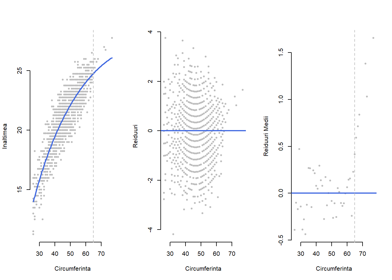 În Figura 1.3 de mai jos avem diagrama de împrăștiere a datelor și curba de regresie care modelează înălțimea medie în funcție de circumferință conform modelului propus, graficul valorilor reziduale precum și graficul valorilor reziduale medii calculate pentru fiecare valoare a circumferinței. Putem observa că modelul propus este ajustat (fitat) mai bine pe date (coeficientul de determinare \(R^2=0.7921904\) este un pic mai mare atât față de cel în care apare doar termenul \(\sqrt{circ_i}\) care este \(R^2=0.7820638\) cât și de modelul de regresie simplă \(R^2=0.7683202\) - acest fenomen fiind absolut normal în contextul modelelor imbricate), în special pentru arbori a căror circumferință este mai mică de 65 cm. Pentru arborii cu circumferințe mai mari modelul sugerează o înălțime medie mai mică decât cea măsurată.