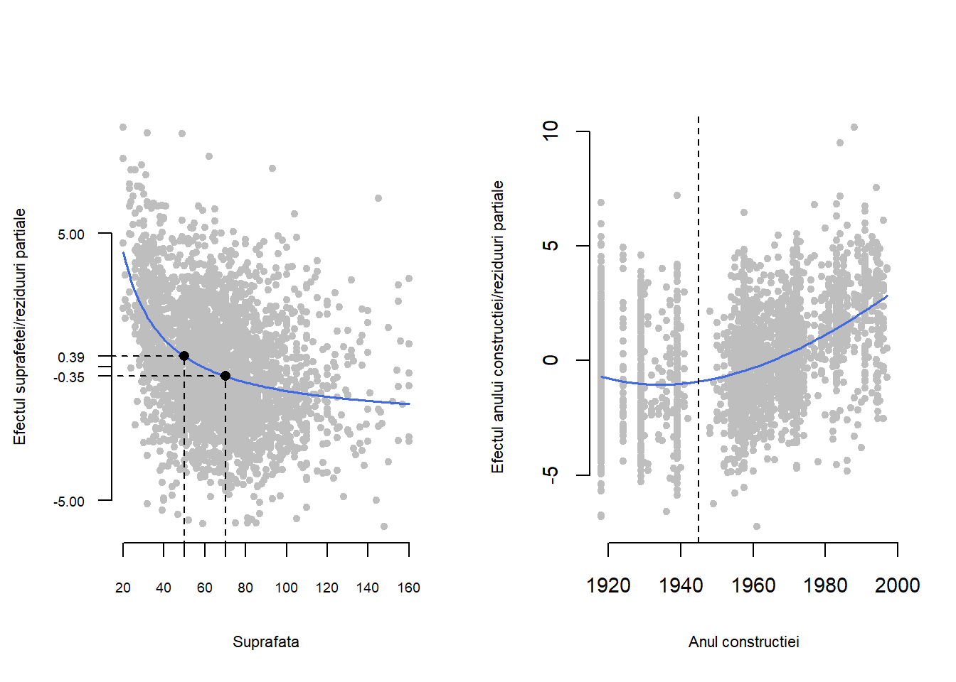 unde \(f_1(suprafata_i) = \beta_1\left(\underbrace{\frac{1}{suprafata_i} - \overline{\frac{1}{suprafata_i}}}_{suprafata{\_inv\_cen}_i}\right)\) iar \(f_2(suprafata_i) = \beta_3\times suprafata_i\). În urma estimării găsim