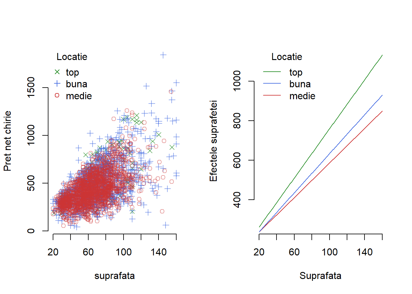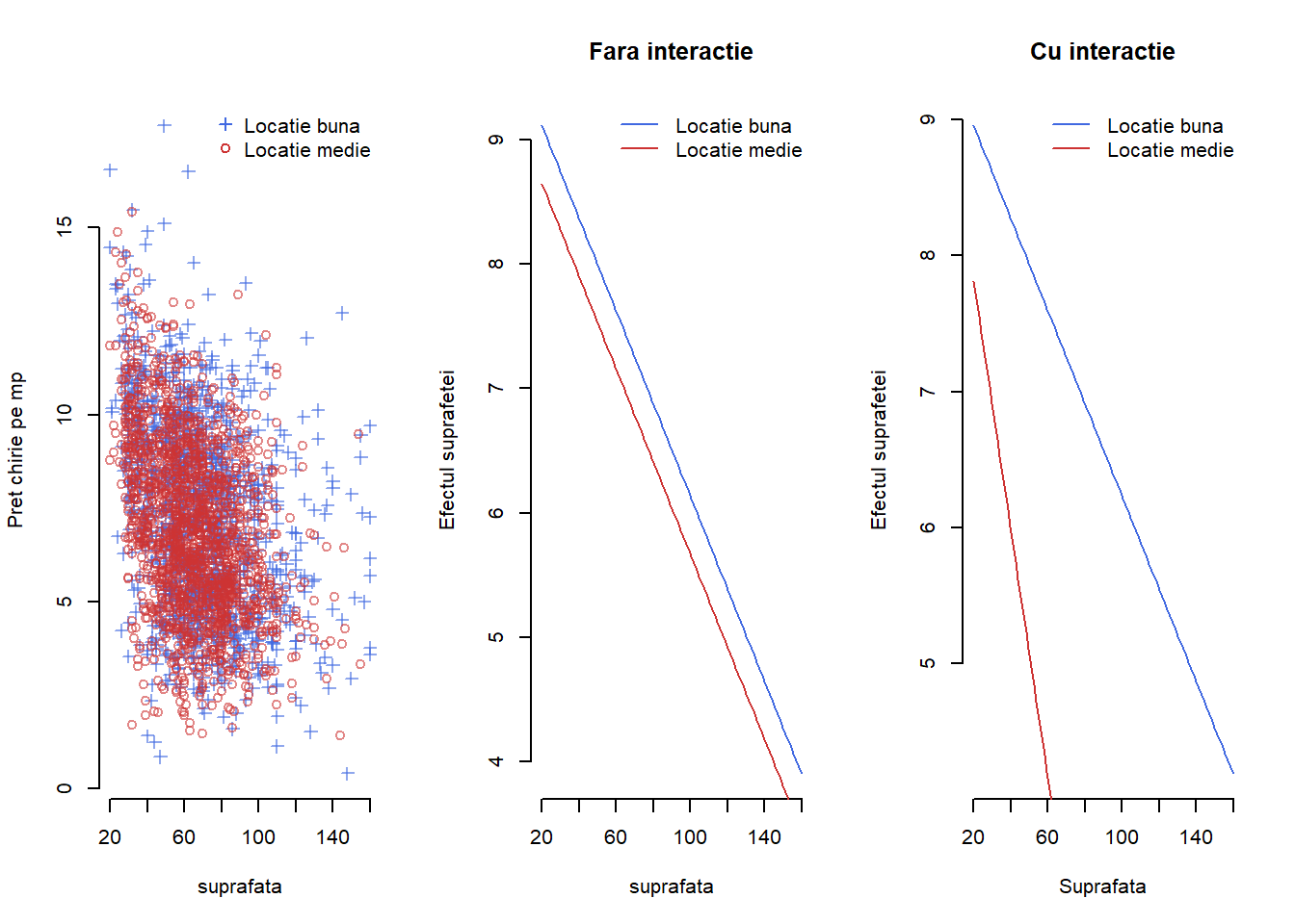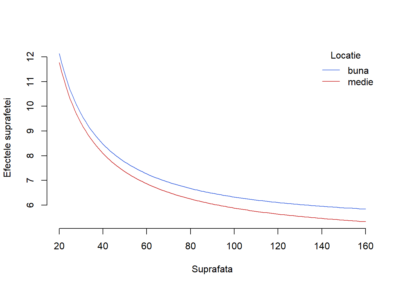 Constatăm că efectele suprafeței pentru apartamentele situate în locații bune și medii sunt similare, chiar dacă cele două curbe nu sunt paralele (ceea ce implică un efect de interacție). Dacă suprafața de locuit crește atunci prețul mediu pe metrul pătrat scade pentru ambele locații. De asemenea, se observă că apartamentele situate în locații bune sunt întotdeauna mai scumpe decât cele din locații medii, indiferent de mărimea acestora. Diferența de preț este mai mică pentru apartamentele cu suprafața mai mică față de cele cu suprafața mai mare ceea ce sugerează că odată cu creșterea în suprafață găsim și o creștere în diferența medie de preț pe metrul pătrat între imobile situare în locații bune și medii, iar această diferență crește liniar.