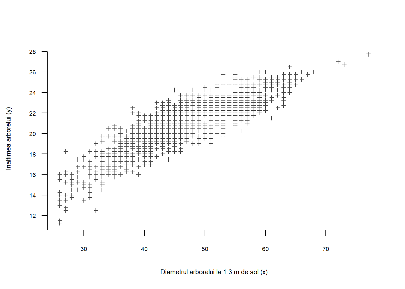 Exercițiul 6.2 (Înălțimea arborelui de eucalipt) Dorim să explicăm înălțimea unui arbore \(y\) (măsurată în metrii) în funcție de diametrul său \(x\) (măsurat în centimetrii) la 1.3 m de sol și de radicalul acestuia. Dispunem de \(n = 1429\) de perechi \((x_i, y_i)\) de măsurători (a se vedea de mai jos).