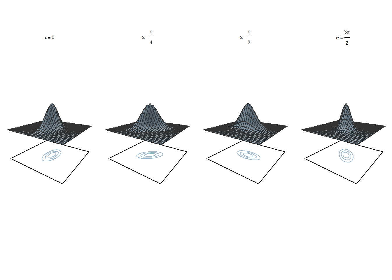 Figura @ref(fig:reg-c8-fig1) de mai jos prezintă patru repartiții normale bivariate (\(n=2\)) \(\symbf Y \sim\mathcal{N}(\symbf\mu, \Sigma_{\symbf Y})\), cu \(\symbf\mu = (\mu_1, \mu_2)^\intercal\) iar \(\Sigma_{\symbf Y} = \begin{pmatrix}\sigma_{11} & \sigma_{12}\\ \sigma_{21} & \sigma_{22}\end{pmatrix}= \begin{pmatrix}\sigma_{1}^2 & \sigma_{12}\\ \sigma_{12} & \sigma_{2}^2\end{pmatrix}\), rotite cu unghiul \(\alpha\). În acest caz densitatea de repartiție este