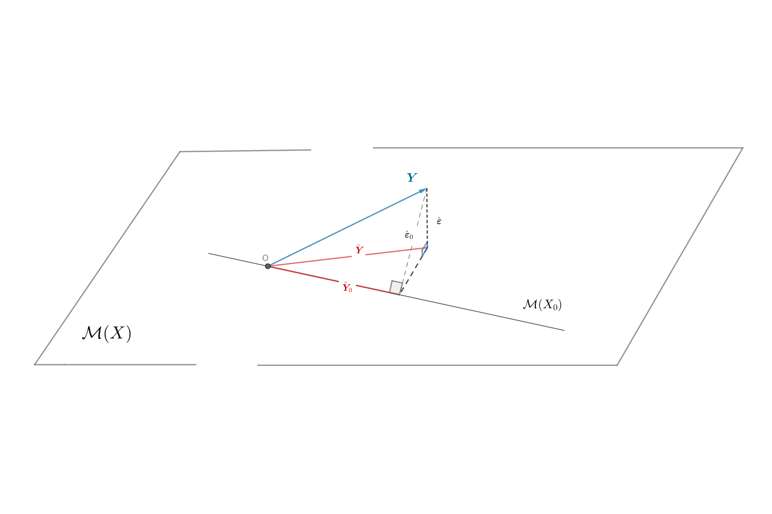 - Notând cu \(\hat{Y}\) și \(\hat{Y}_{0}\) proiecțiile ortogonale ale lui \(Y\) pe \(\mathcal{M}\) și \(\mathcal{M}_{0}\), și justificând faptul că