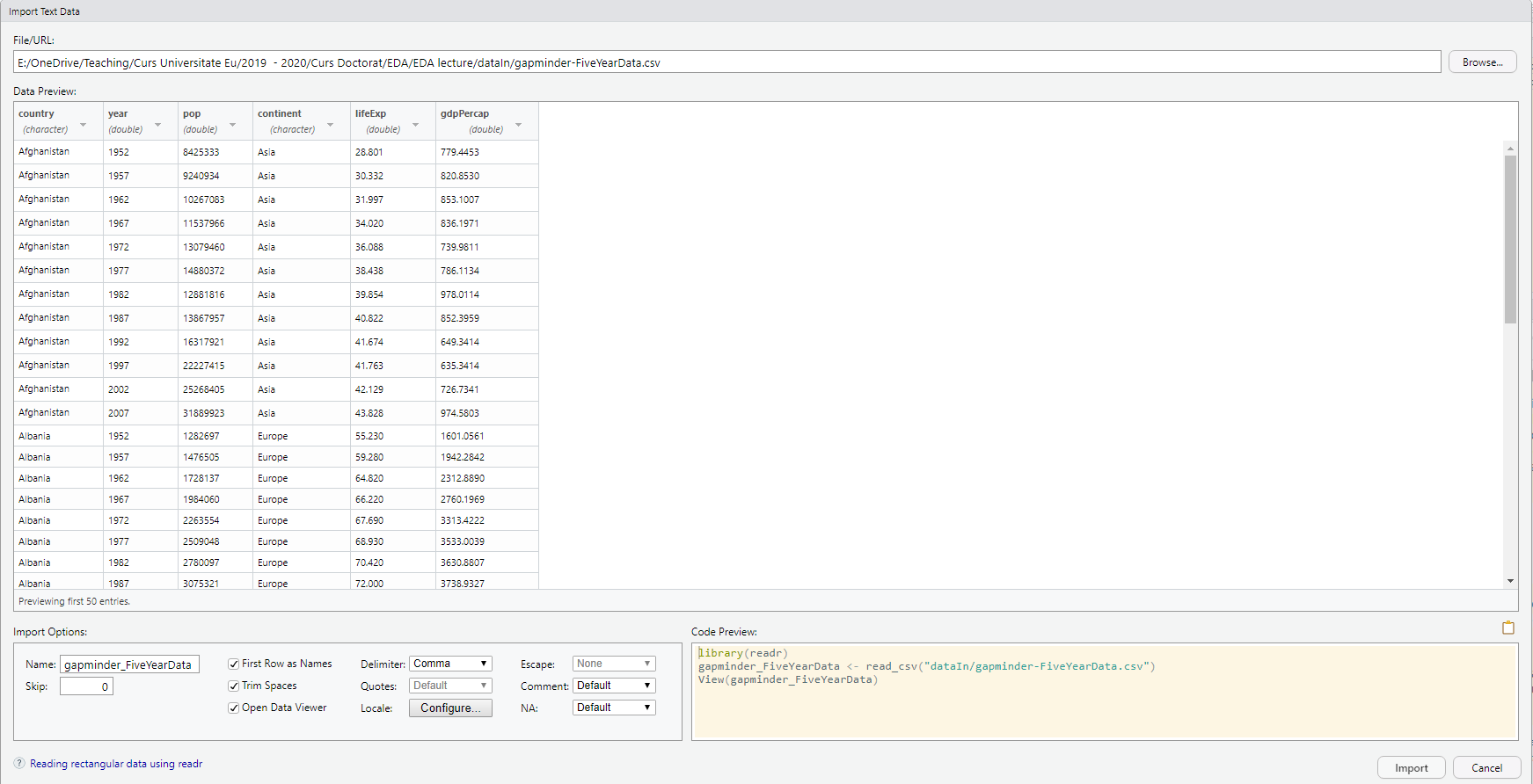 skip=1)Alternativ se pot folosi și alte funcții precum read_csv2() atunci când separatorul este ;, read_tsv() atunci când separatorul este tab sau, mai general, read_delim() atunci când separatorul este un alt simbol.