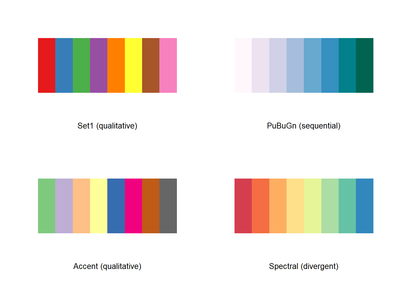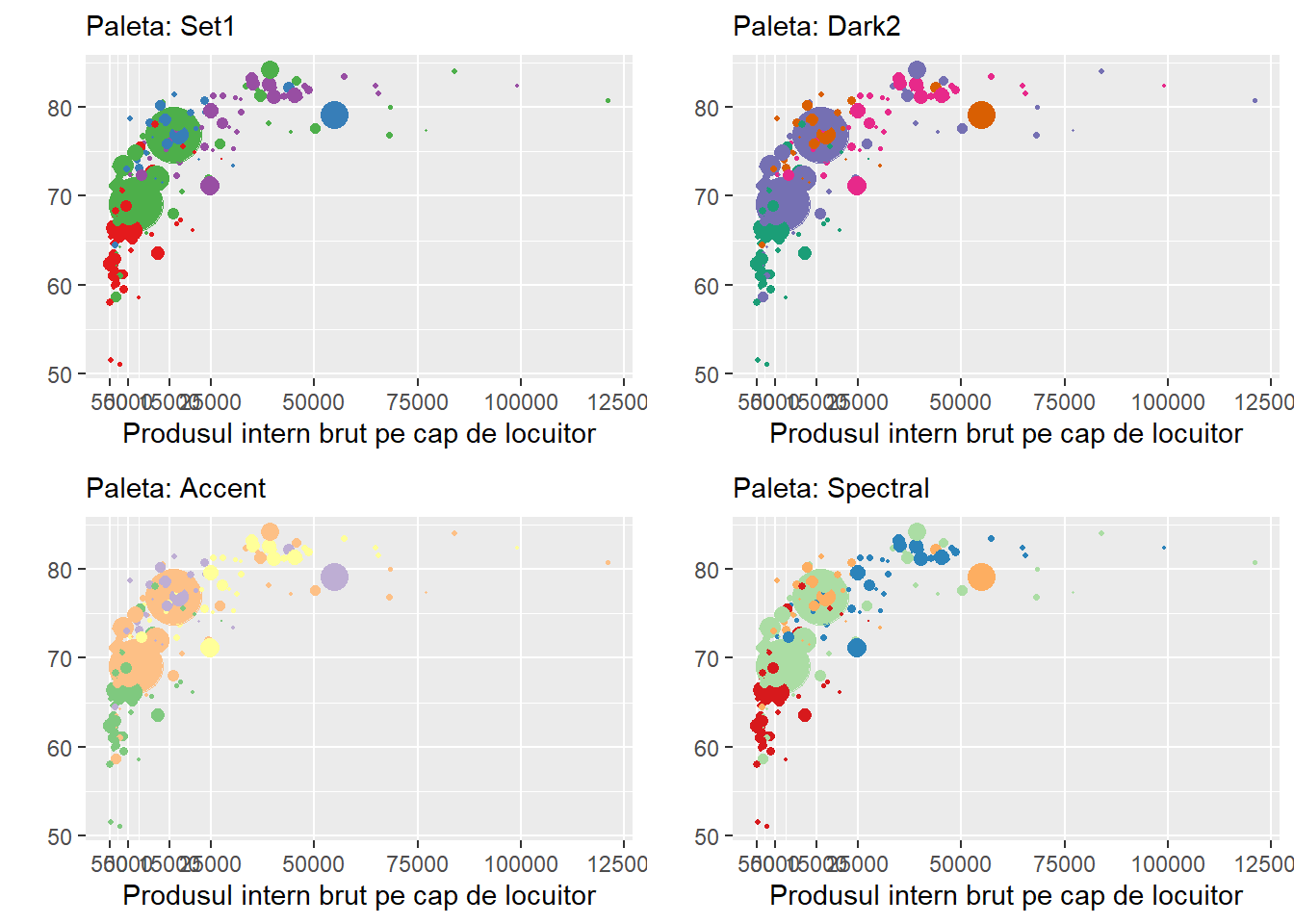 scale_fill_hue(l = 80)Următoarele grafice prezintă aceeași figură (situarea țărilor din setul de date gapminder_2018 în funcție de produsul intern brut pe cap de locuitor și durată medie de viață) ilustrată cu ajutorul funcției scale_[estetică culoare]_brewer() pentru patru palete de culori diferite:
