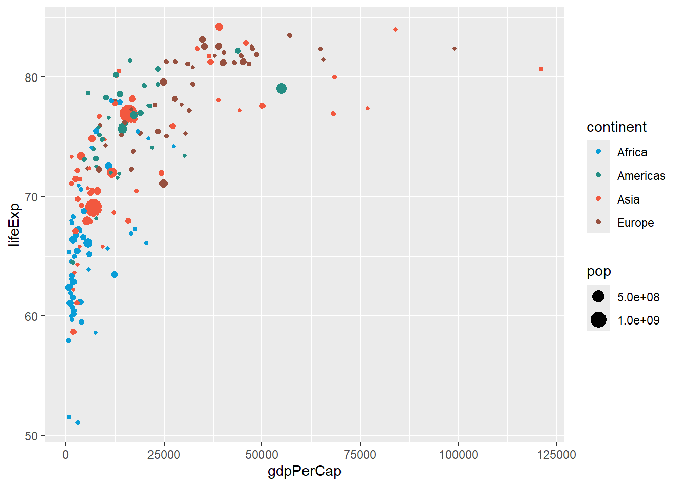 ggplot(gapminder_2018, aes(x = gdpPerCap, y = lifeExp, colour = continent, size = pop)) +