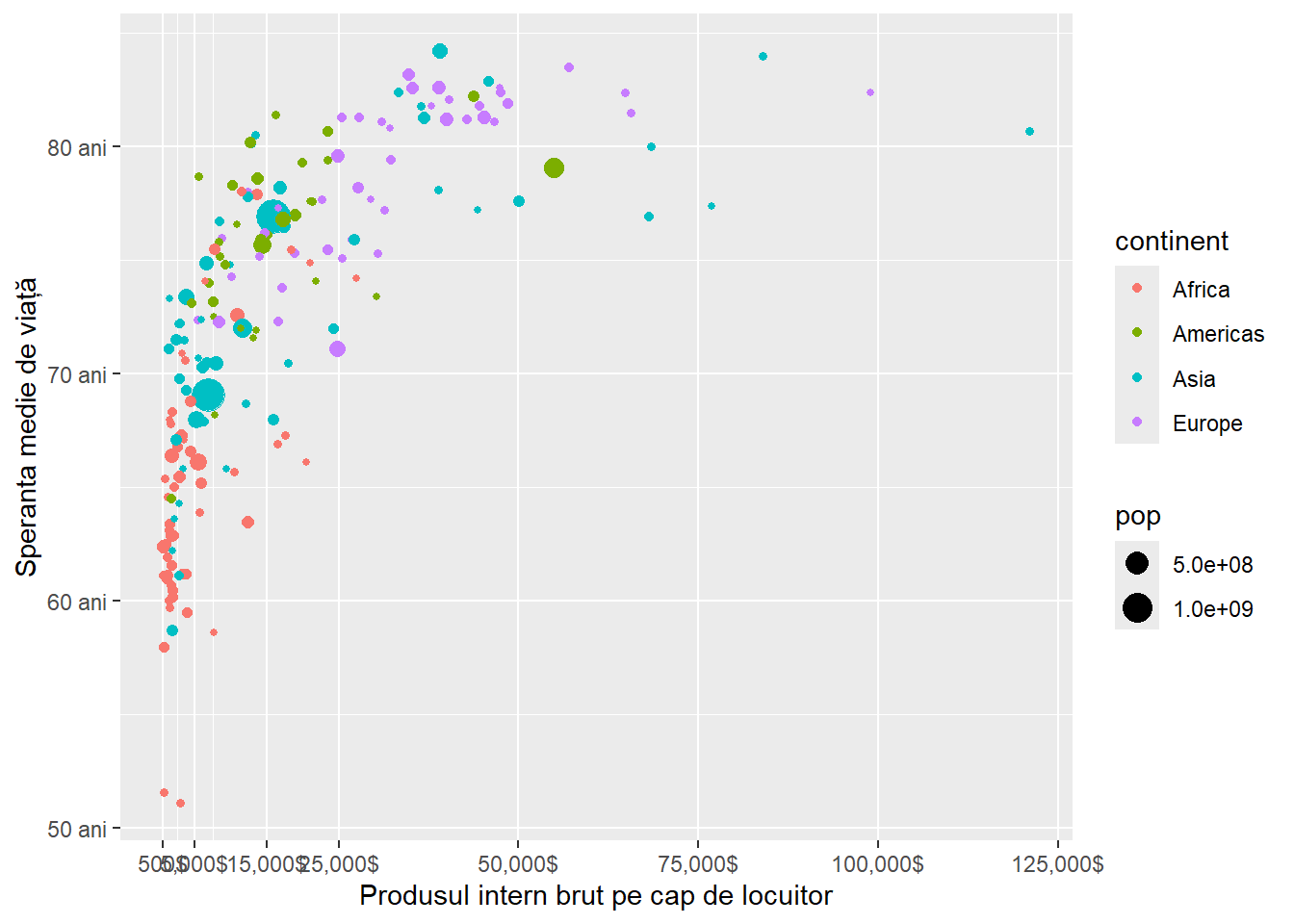 În plus, putem să adăugăm funcții ca argument al parametrilor breaks și labels, în primul caz funcția returnând un vector de valori numerice care să corespundă elementelor de marcaj iar în cazul etichetelor va primi ca date de intrare un vector numeric de elemente de marcaj și va returna un vector de etichete. De exemplu, pentru a adăuga simbolul $ în dreptul valorilor produsului intern brut vom folosi funcții din pachetul scales precum dollar_format() iar pentru a modifica axa y vom crea propria funcție: