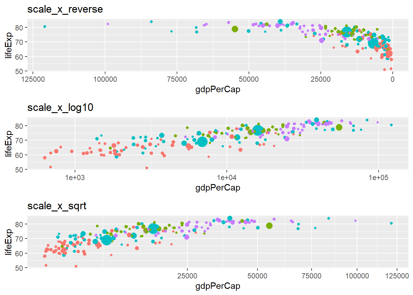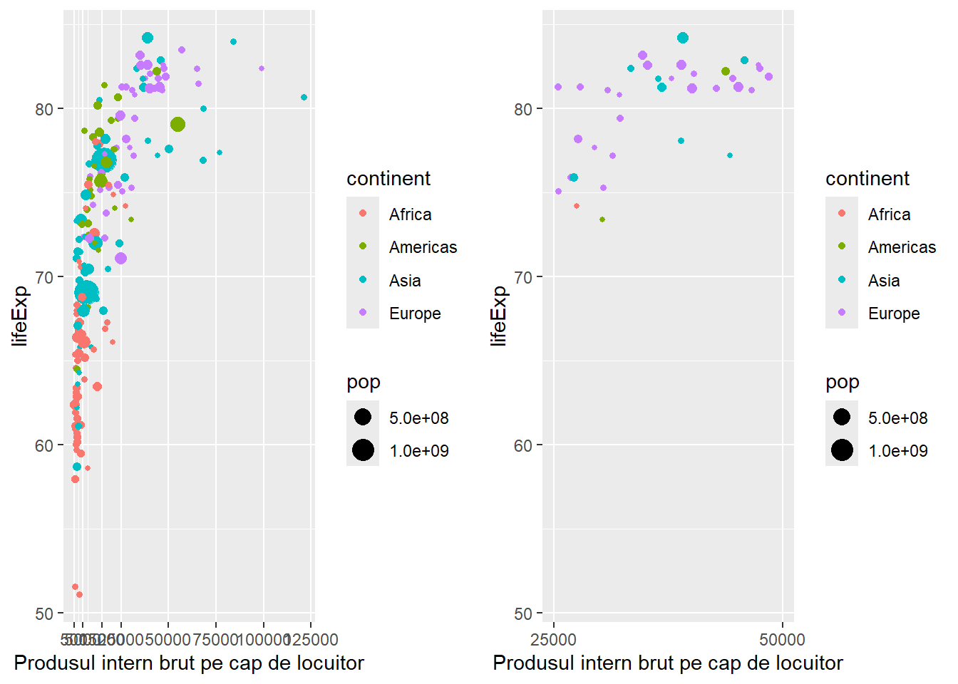 Pachetul ggplot2 pune la dispoziție și o serie de scale care permit modificarea axelor, de exemplu, prin inversarea valorilor (i.e. scale_x_reverse) sau prin transformarea acestora într-o scală logaritmică (folosind scale_x_log10 sau scale_x_continuous(trans = "log10")) ori printr-o altă funcție (i.e. scale_x_sqrt sau scale_x_continuous(trans = "sqrt")). Pentru mai multe transformări se poate consulta documentația funcției scale_x_continuous la argumentul trans.