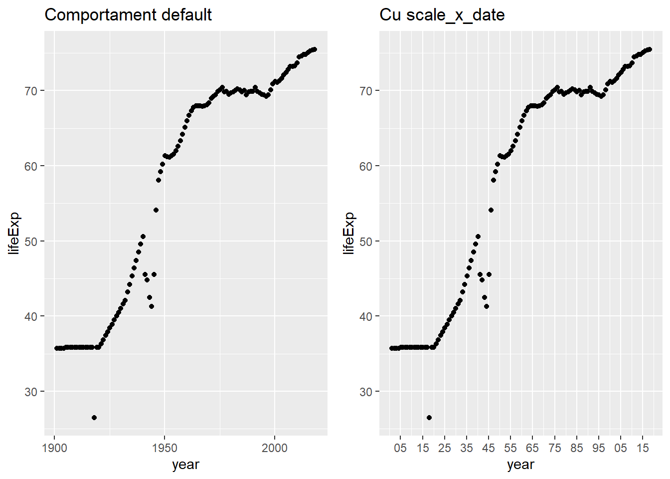 Atunci când avem de-a face cu variabile/date care sunt în format de date de timp (format Date sau POSIXct) este recomandată utilizarea funcțiilor predefinite scale_x_date și respectiv scale_x_datetime care dispun în plus de argumentele date_breaks și date_labels. Argumentul date_breaks permite poziționarea elementelor de marcaj în funcție de unitățile de timp (ani, luni, săptpmâni, etc.), astfel date_breaks = 2 years va pasa marcaje din doi în doi ani. Argumentul date_labels asigură ilustrarea etichetelor pentru marcaje în format strptime().