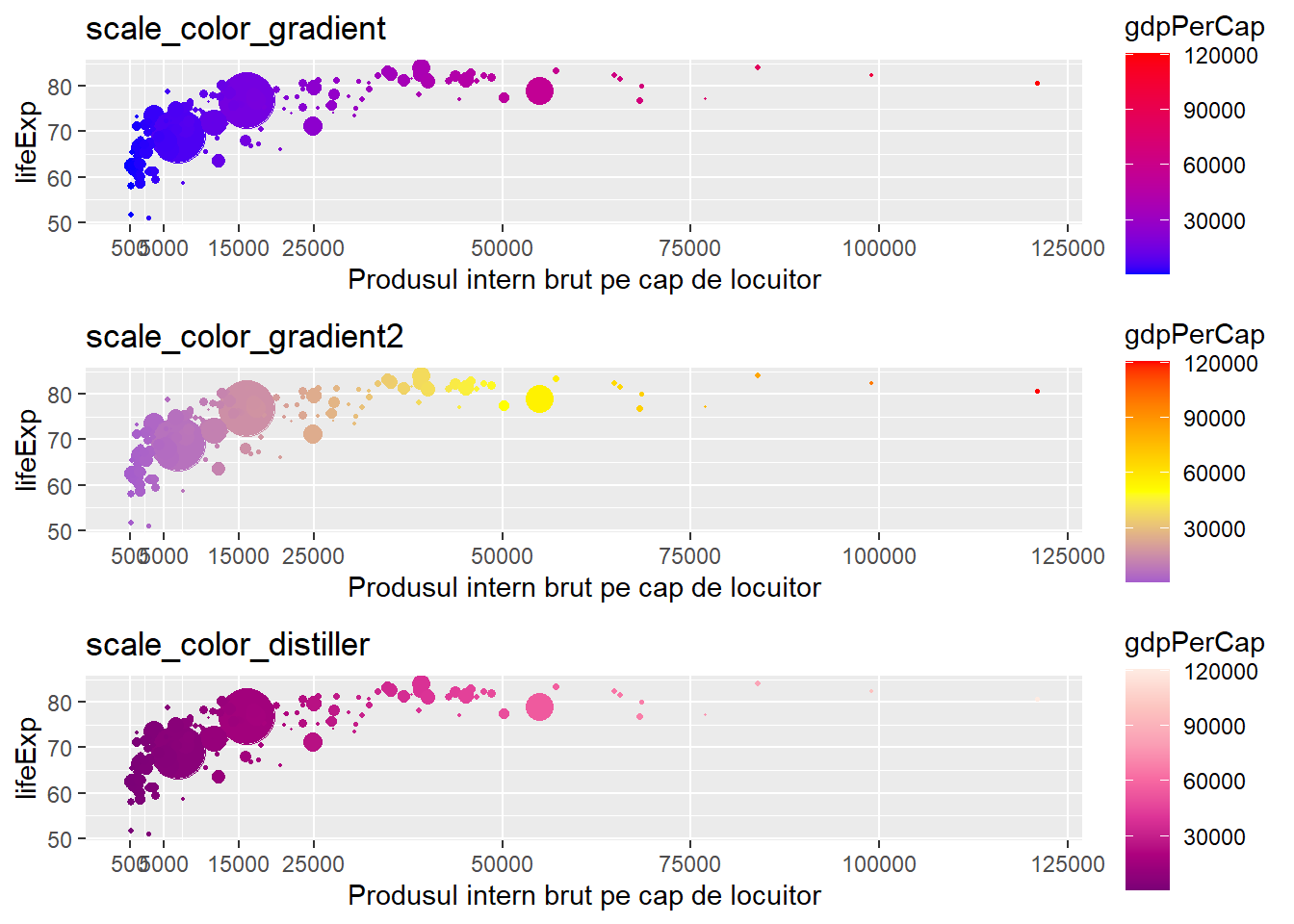 Atunci când utilizăm variabile continue se folosesc gradiente de culoare prin intermediul funcțiilor generice de forma scale_[estetică culoare]_[tip], după cum urmează