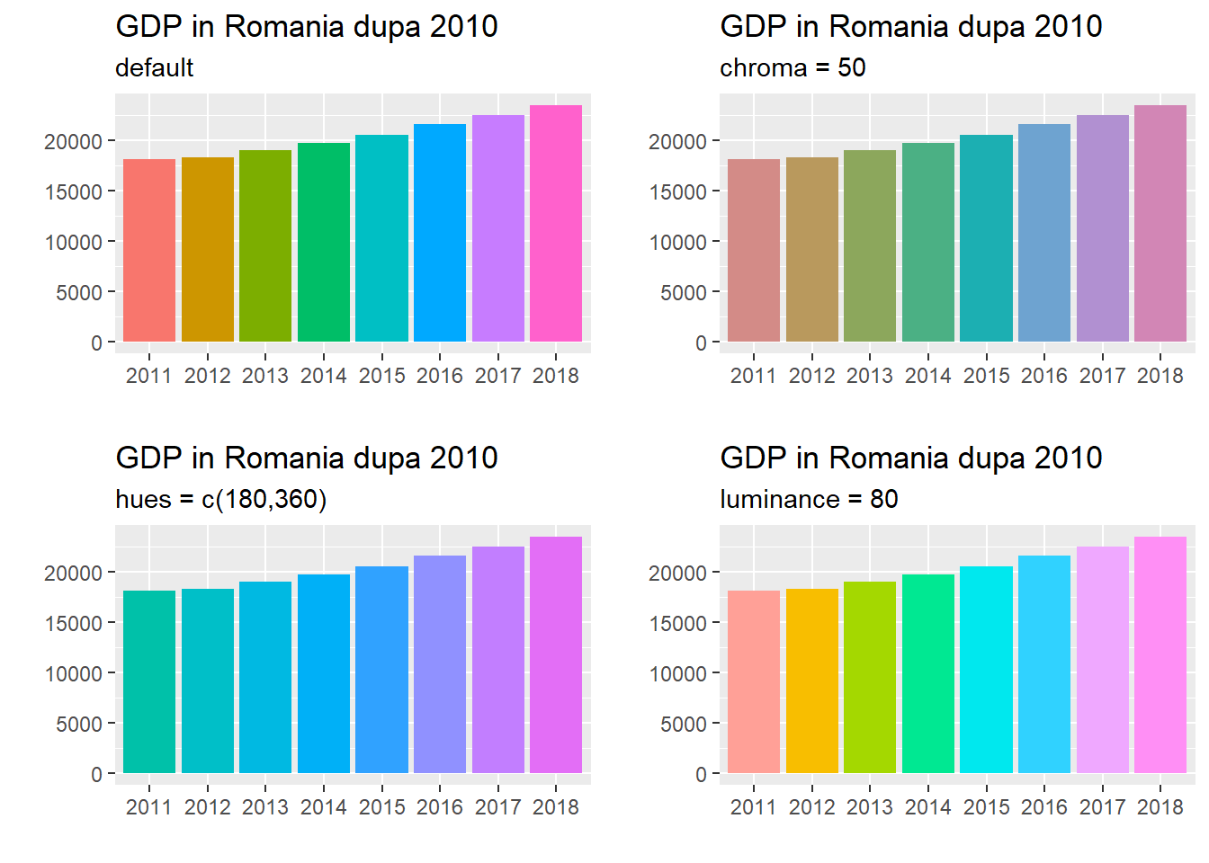 O altă clasă de scale des folosite sunt cele care corespund esteticii de culoare (colour - culoarea marginală/exterioară și respectiv fill - culoarea de umplere). Pachetul ggplot2 pune la dispoziție mai multe tipuri de scale diferențiate după cum variabilele de scalare sunt continue sau discrete. Spațiul culorilor din ggplot2 este de tip HCL (hue, chroma și luminance), pentru mai multe detalii se poate consulta http://www.handprint.com/HP/WCL/color7.html, dar se pot folosi si palete de culoare de tip Brewer (pentru explorarea acestora se poate vizita https://colorbrewer2.org/). Acestea din urmă pot fi clasificate în trei categorii: secvențiale, divergente și calitative unde primele două categorii corespund variabilelor continue iar cea de-a treia corespunde variabilelor cu valori discrete.